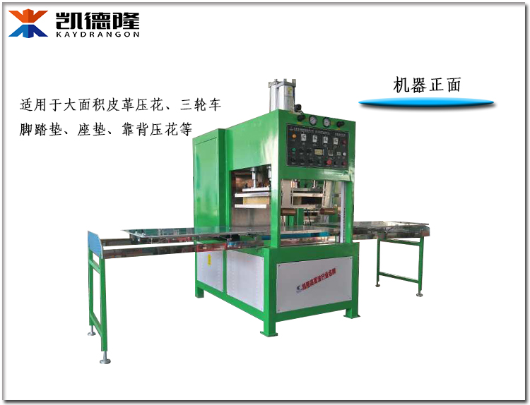 高周波电动车脚垫压花机设备说明:1、周率稳定;采用国际工业波段27.12MHZ,输出周率稳定,符合国际工业波段标准。2、输出力强:低损耗同轴振荡器,同调调谐器,输出力强缩短熔接时间,提高产量。3、安全性能;无论是突然遇到停电还是停气时,机器都是静止状态,不会突然上升或下降;提高工人操作安全问题。4、高速同调器;依产品的大小和物料厚度调节,能大大地降低必要之熔接时间,提高机器之生产量。5、防干扰装置;配置有频率稳定器及高频磁场屏蔽系统装置,将高频干扰降低。6、加固式机架;平稳耐用。7、加热功能;适用不同产品加工需要。8、进口配件;重要的配件均适用日本、俄罗斯、美国以及台湾的正品电子原件。9、左右推盘操作;适用于较大尺寸的塑料(塑胶)产品热合焊接或者封口。