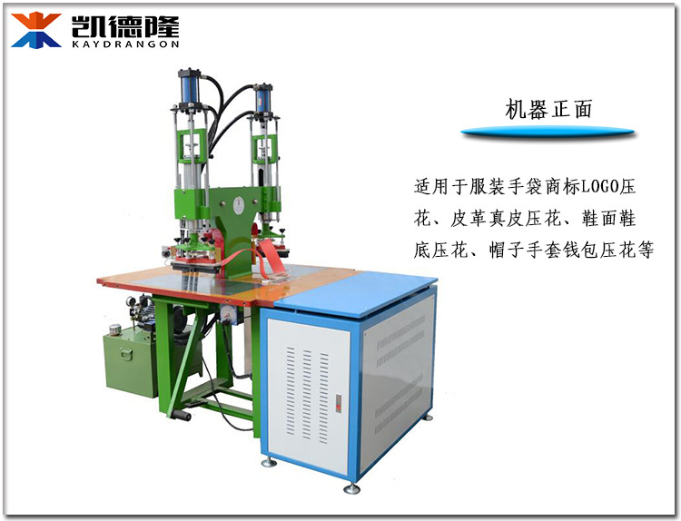 高周波油压机,双头油压式高周波机又名油压高周波机,压花机,压字机压痕机等。适合于鞋类高周波压熔成形、P.V.C高周波滴胶熔接、皮革大面积高周波深度印花、高周波印字、高周波切边等高周波制品加工。